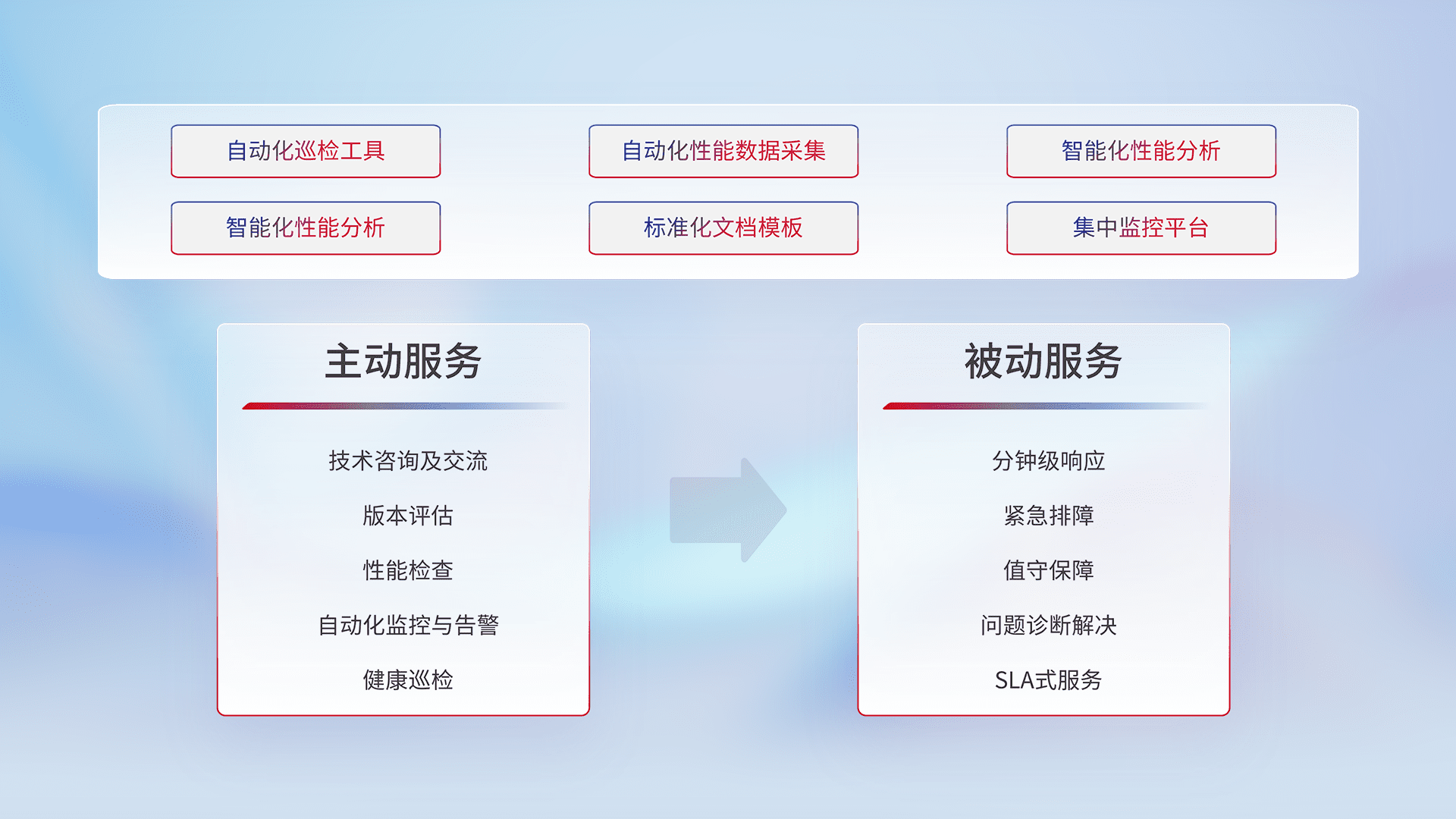 智能化工具和标准化文档,,保障服务质量,,,,提供主动服务(包含技术咨询、、、、版本评估、、性能检查、、、、自动化监控与告警、、、、健康巡检)和被动服务包含(分钟级响应、、紧急排障、、、值守保障、、、、问题诊断解决、、、、SLA服务)。。。。